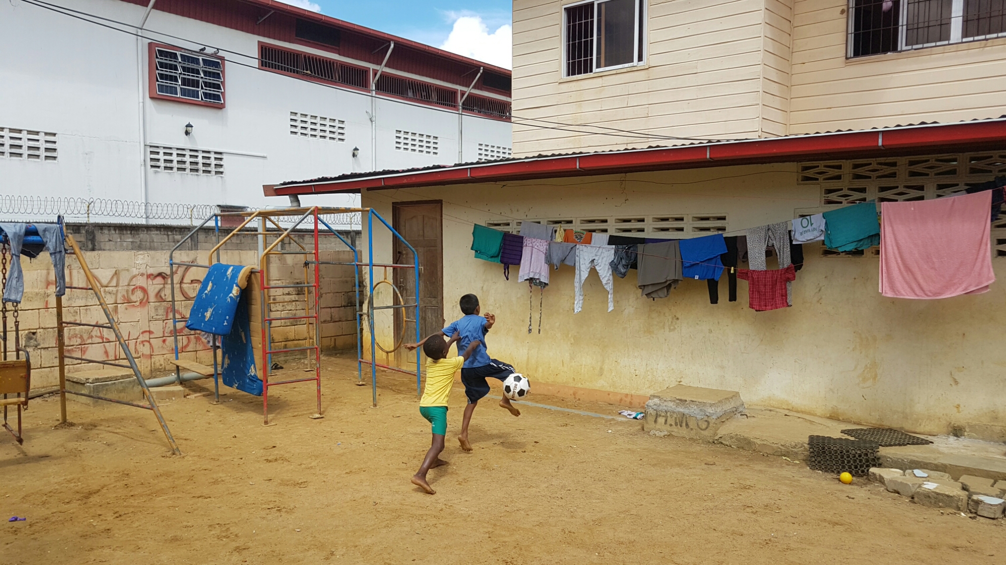 Maar vandaag was een fijne dag, eentje zonder grote zorgen en vooral veel plezier en gelach. Na al dat ochtendroutine van mij, gingen Sharie en ik weer naar de kinderen toe. Sharie had een bal meegenomen vanuit België en had deze vandaag mee. Maar de kokkin had andere plannen en wilde graag nog minimaal één keer samen koken. Dus ging ik aan de slag met de kip. Tussendoor kwam Sharie de foto’s tonen van de kinderen die aan het voetballen waren. De kip moest toch gaar worden, dus ik besloot mee te doen met het voetballen.