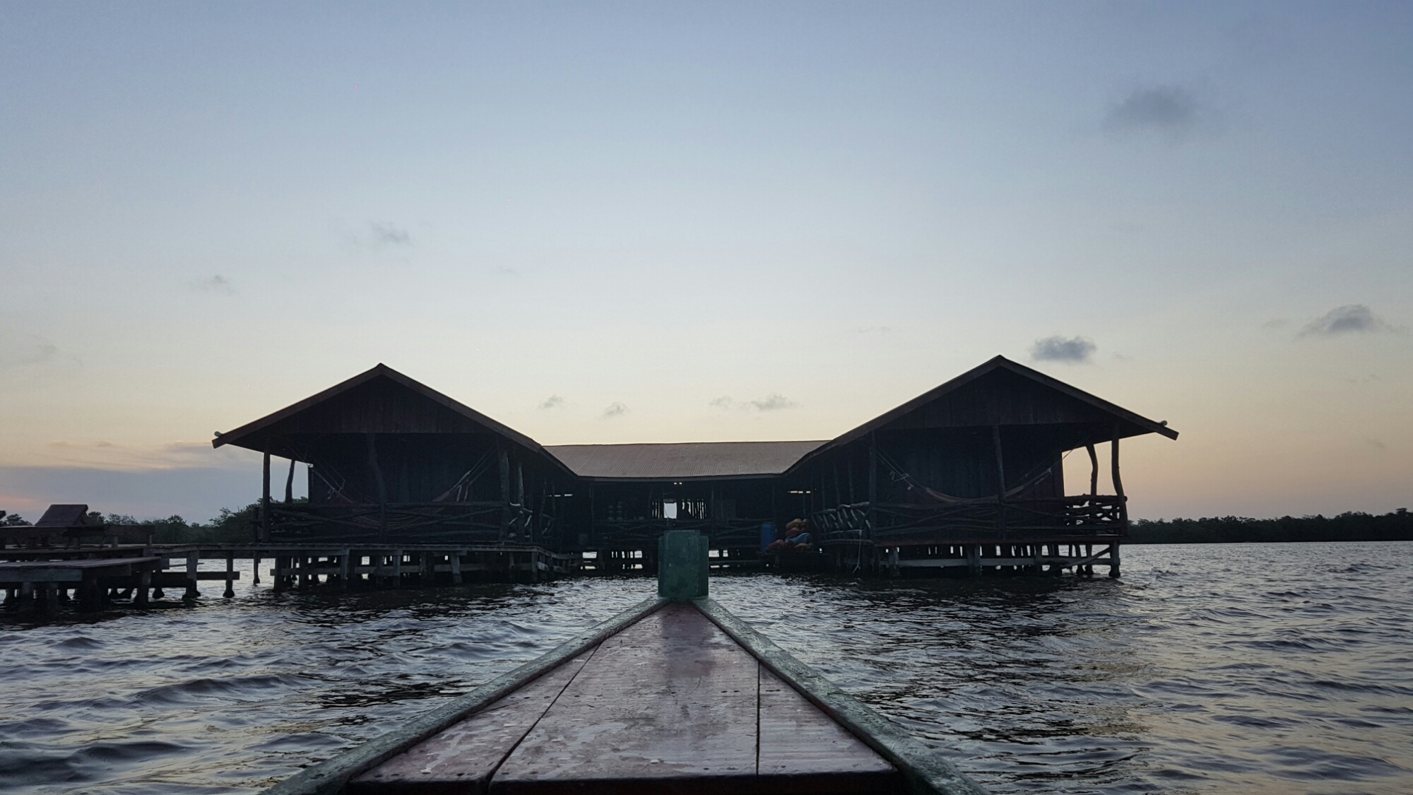 Ineens doemt het meer op uit de mangrove en zien we de lodges. Ronnie grapt dat een in elkaar gezakte lodge die van ons is, maar eigenlijk is de lodge er echt een van pure schoonheid. We krijgen de kamers toegewezen waarna het tijd is voor de lunch. Niet laat daarna verrekken we voor een tocht over het meer. Waarbij we een visnet gaan uitzetten om eten voor de avond binnen te halen.