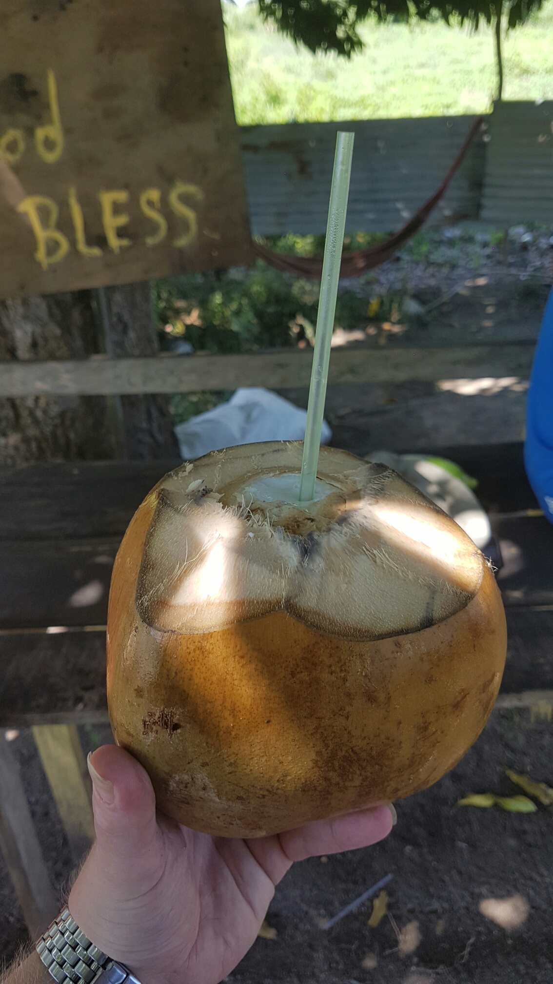 Bij de volgende stop, wacht een heerlijke verrassing. We zijn in het district (provincie) Coronie, het district van de kokosnoot. Dus krijgen we een heerlijke verse kokosnoot van Ronnie. Eerst het sap, wat ik persoonlijk het lekkerste vond, en vervolgens het vruchtvlees zelf. Ook lekker, maar geef mij het sap maar. Maar zo’n heerlijke kokosnoot, onder een boom omringd door palmbomen, het is genieten.