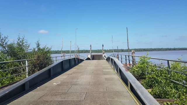 Als we verder rijden is onze volgende stop pas in Nickerie zelf. De bijna eindbestemming van de tour. Vanaf hier zullen we boot pakken naar Bigi Pan. Maar we zijn er, ondanks alle tussenstops, wat te vroeg en rijden naar de grens van Suriname en Brits Guyana. Ook deze grens is, net als die met Frans Guyana, een rivier. Maar we zien het andere land liggen. Konden we maar even oversteken denk ik, dat zou weer een land erbij zijn op mijn lijstje.