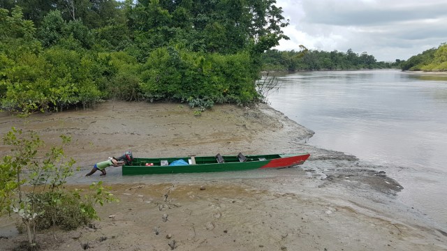 Eenmaal aan de kust, is het niet een hagelwit strand wat voor ons ligt met palmbomen, maar vooral veel klei en modder. Maar daarvoor zijn we hier. Terwijl Sharie van een hoger punt het water in springt, waag ik mij door de modder en klei. Ik zak er keer op keer in weg, makkelijk tot aan mij bovenbenen. Het is dan ook loodzwaar om zo het water te bereiken, dus kom ik in de stroming even bij. Daarna is het tijd voor een modder gevecht met de bootsjongen en voor ik het weet, zit de modder overal. Het is leuk om mee te maken, maar na een uurtje zijn we wel toe aan een afspoelbeurt. Dus keren we terug naar lodge. Daar neem ik een extreem lange douche, want zonder waterdruk is het lastig om mij overal helemaal schoon te krijgen.