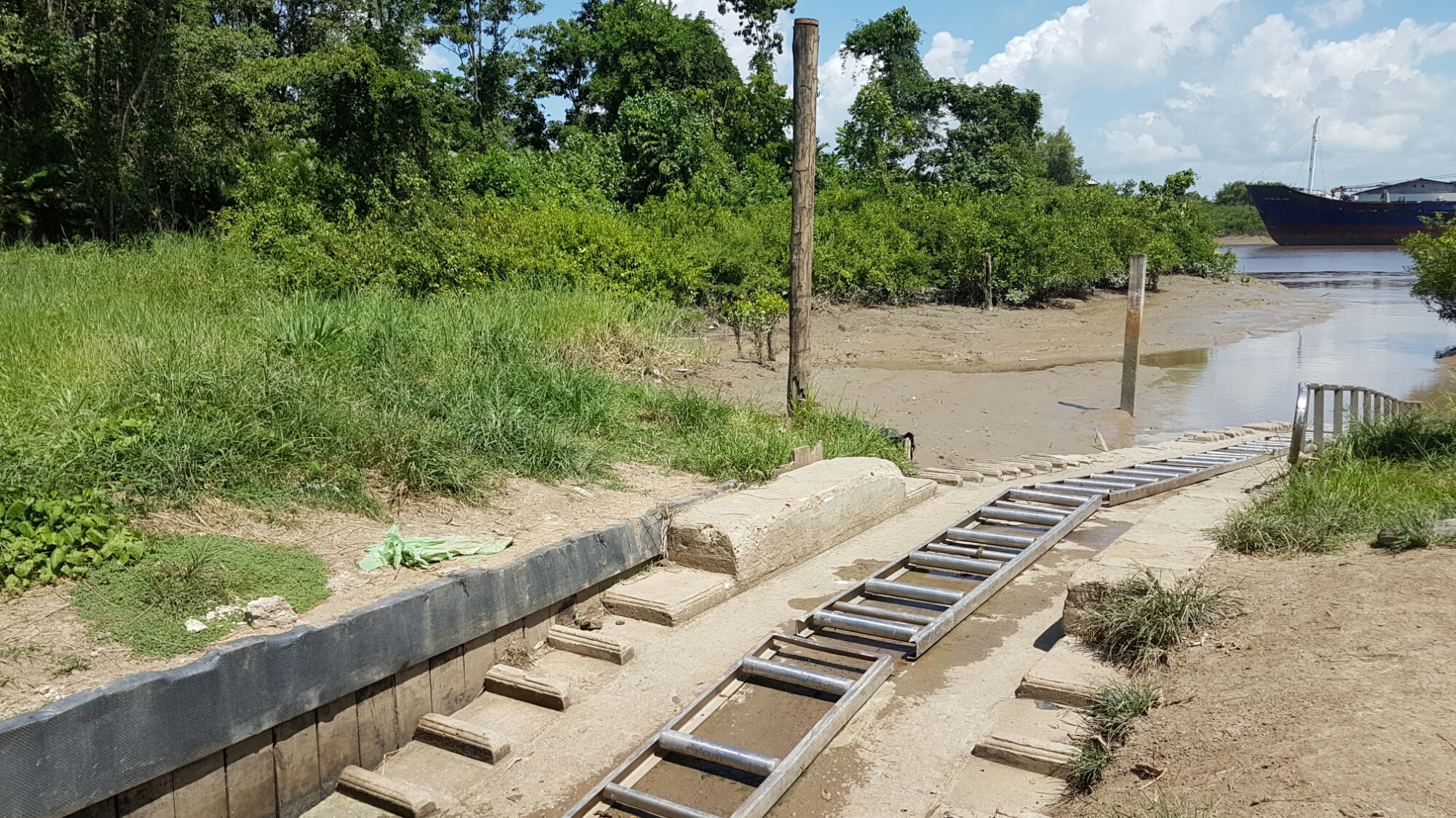 We rijden naar het zuiden en stoppen aan de oever van een rivier. Onze tour gids Ronnie verteld dat de inwoners vroeger de veerpont moesten pakken, wat ervoor zorgde dat je reis makkelijk met drie uur verlengd werd als je pech had. Tegenwoordig is er een brug maar de oude aanlegplaats is er nog steeds.